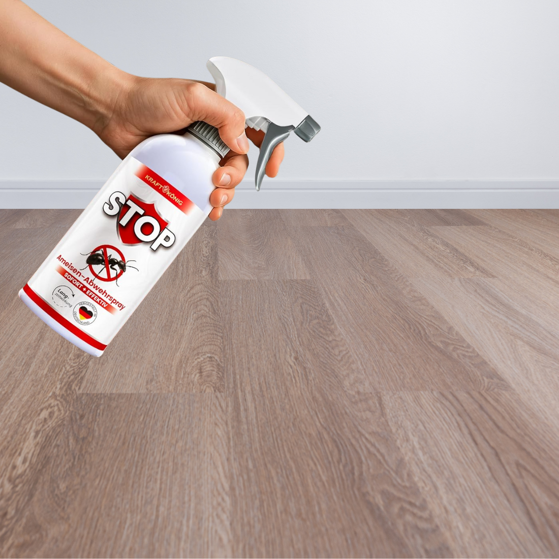Das KRAFTKÖNIG Ameisenspray ist vielseitig einsetzbar und bietet dauerhaften Schutz vor Ameisen – drinnen wie draußen. Ob auf Fliesen, an Türrahmen, entlang von Fußleisten oder an Wegen: das Insektenspray kann überall dort angewendet werden, wo Ameisen aktiv sind.