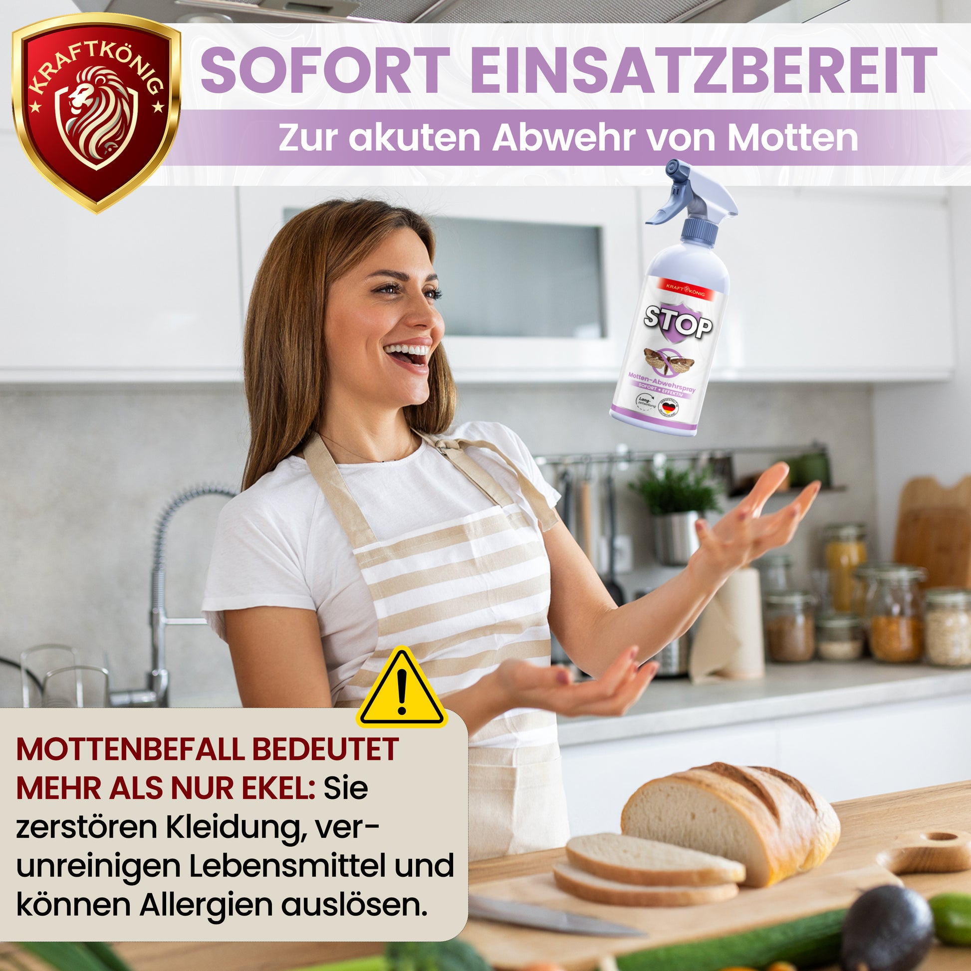 Das KRAFTKÖNIG Mottenspray ist die moderne Antwort auf ein uraltes Problem: Es schützt dein Zuhause effektiv vor Kleidermotten und Lebensmittelmotten – ganz ohne Chemie, ohne Geruch und ohne Risiko.